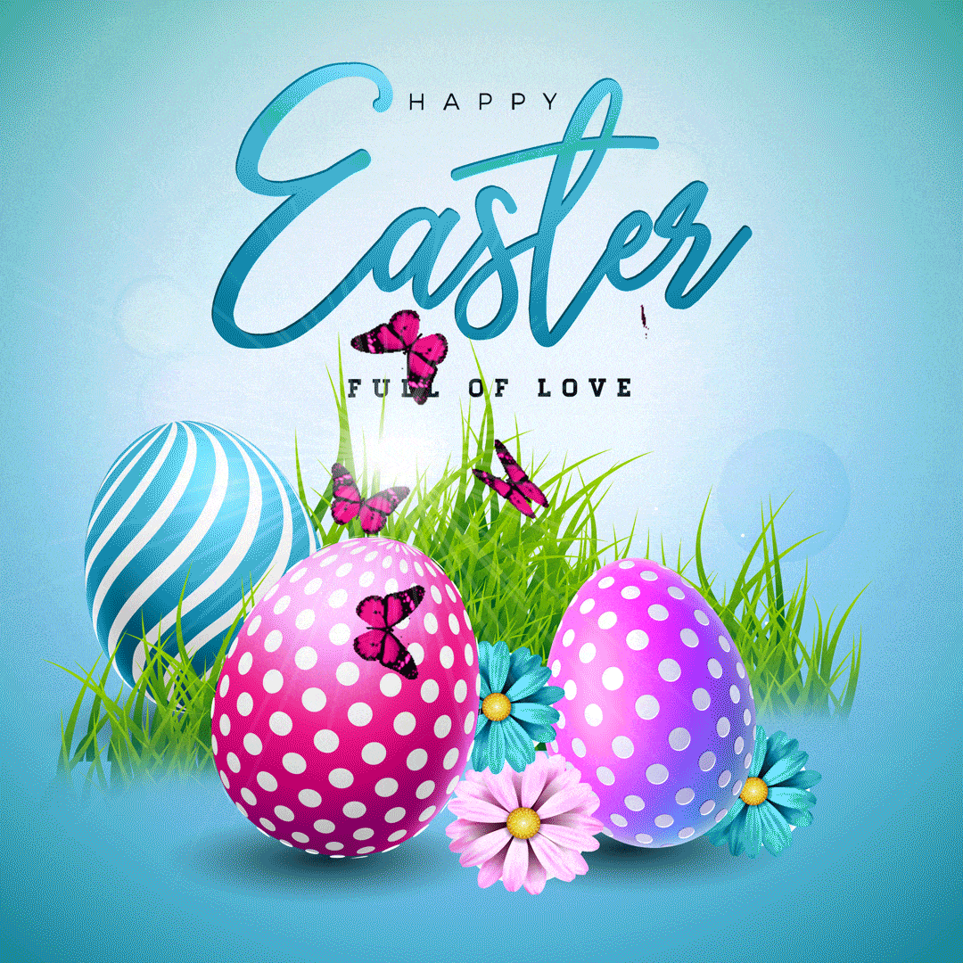Realistic colorful easter eggs with butterflies, flowers and easter wish social media GIF post