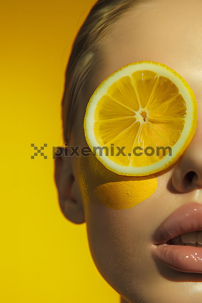 Creative fashion portrait with lemon slice on eye, yellow background.