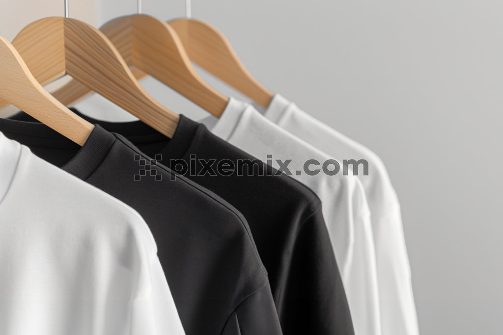 Minimalist black and white t-shirts on wooden hangers in a clean, modern wardrobe setting stock image.