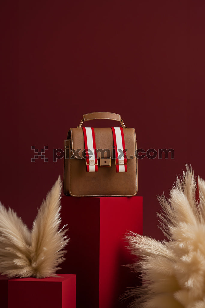 Stylish brown leather handbag with red and white straps on display against burgundy and red backdrop.