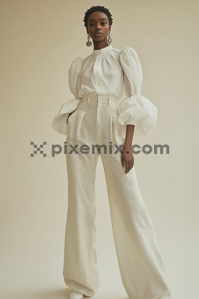 Elegant woman in puff-sleeve blouse and wide-leg trousers posing in neutral-toned fashion stock image.