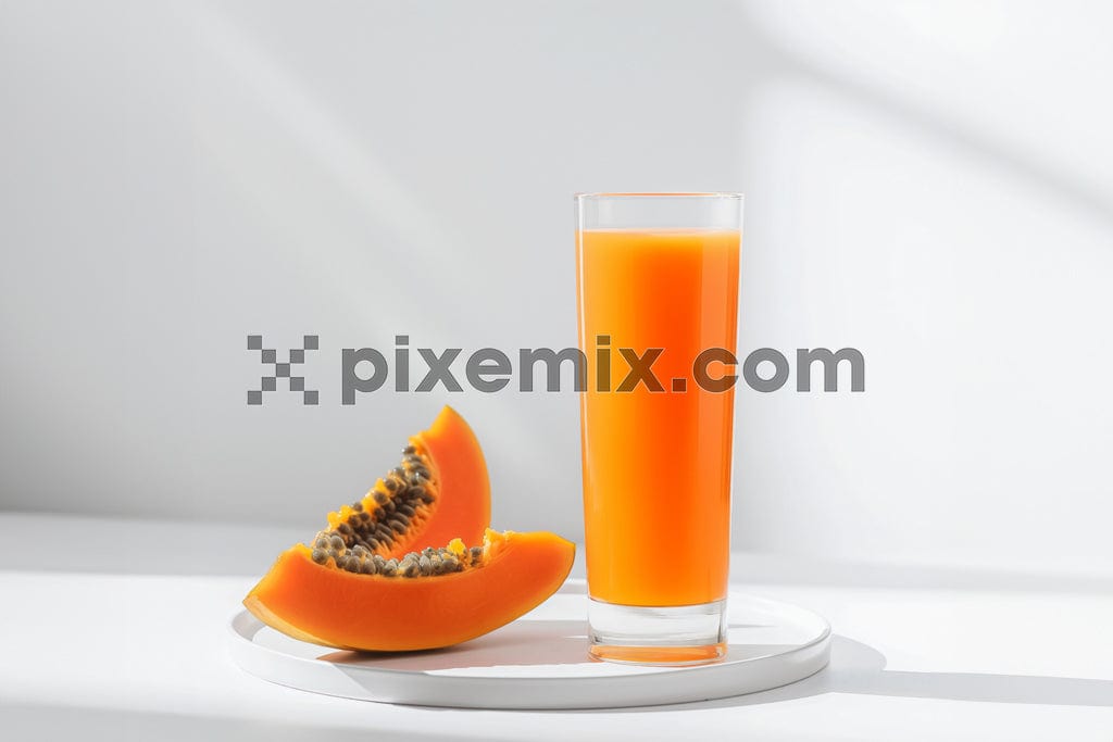 Glass of pappya juice and slices of pappya fruit on white background image.