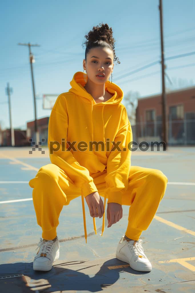 Fashionable woman wearing trendy yellow sport chic style outfit posing in stree image.