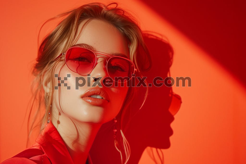The image shows a beautiful blonde girl wearing vibrant red sunglasses.