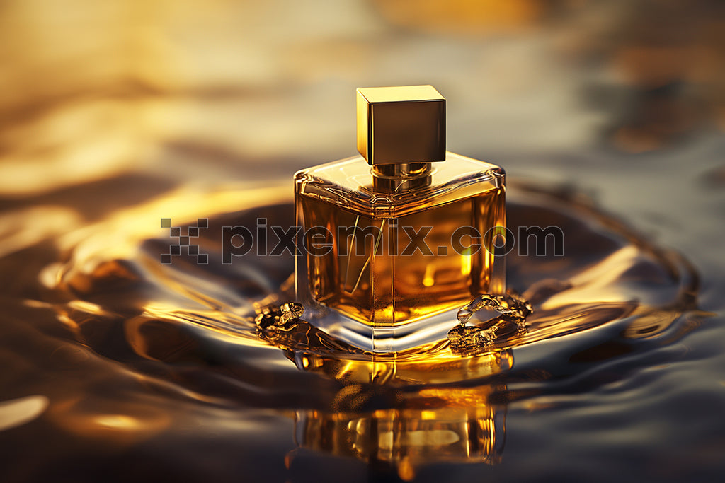 Luxurious golden perfume bottle floating on shimmering liquid stock image.