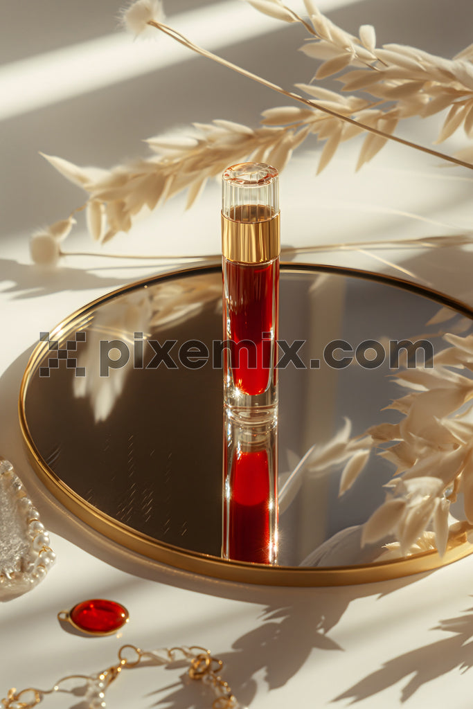 Luxury beauty product photography featuring a red lip gloss in a gold-accented tube, elegantly placed on a mirrored tray with soft natural light stock image.