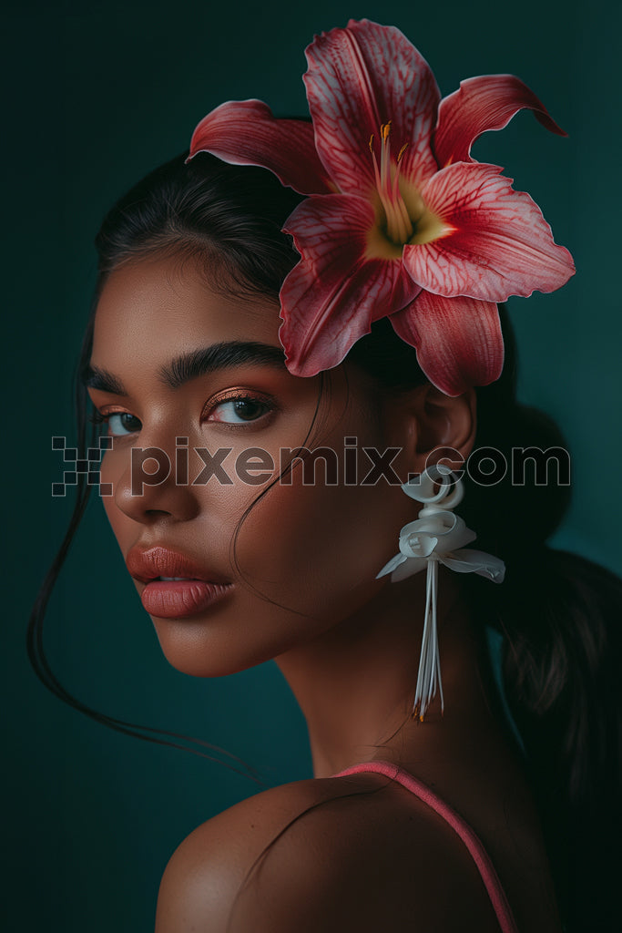 A captivating portrait of a woman with glowing skin, adorned with a bold red lily in her hair and artistic floral earrings, set against a deep green background.