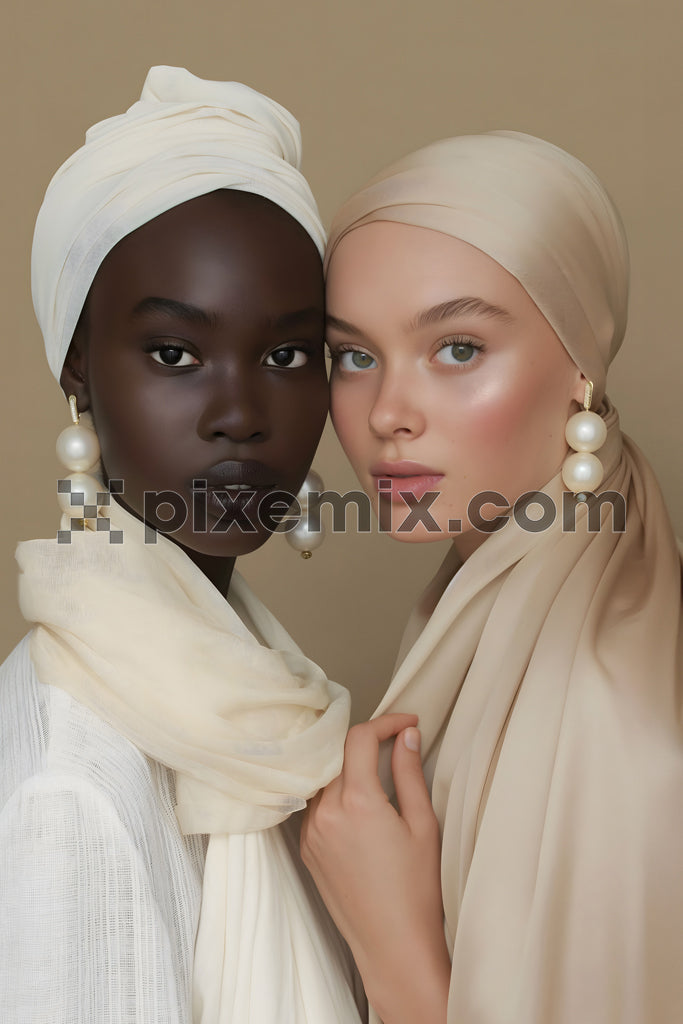 Two elegant women in neutral-toned headscarves pose gracefully, adorned with statement pearl earrings stock image.