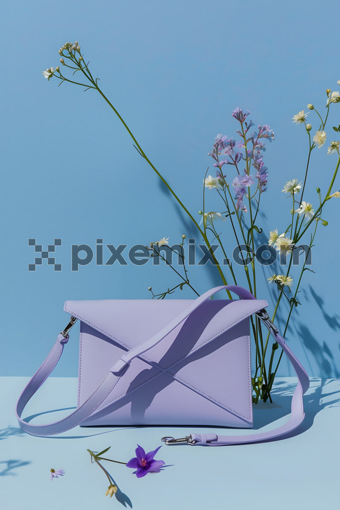 Elegant pastel purple handbag placed against a floral background with a vibrant blue sky stock image.