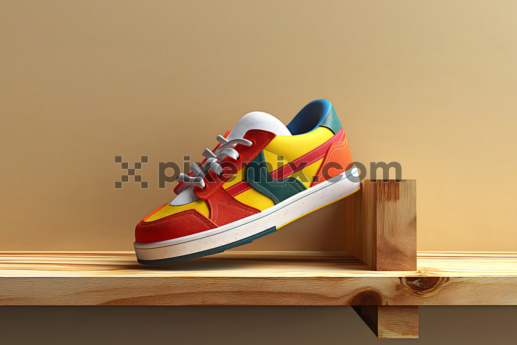 A vibrant, multicolored sneaker displayed on a wooden shelf, combining bold hues of red, yellow, and blue stock image.