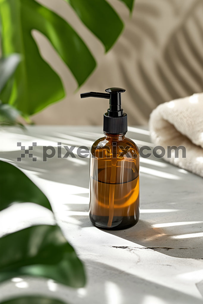 Amber glass soap dispenser with black pump nozzle on a marble countertop, surrounded by green monstera leaves and soft natural light.