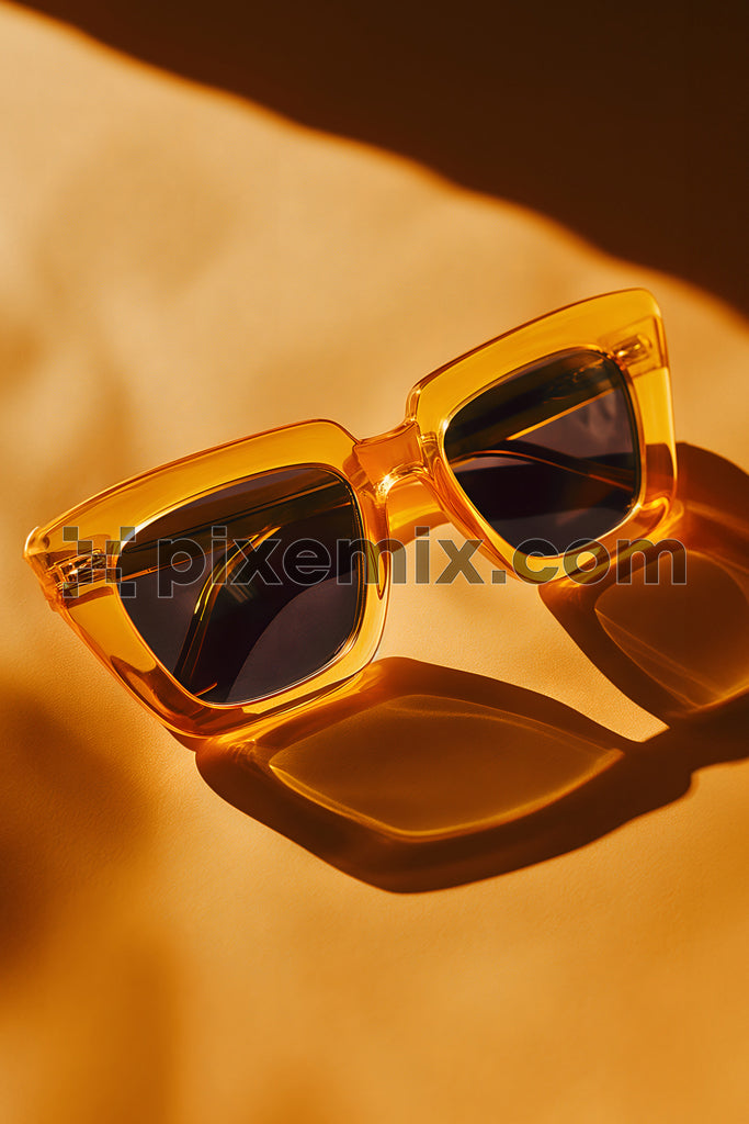 A stunning pair of amber-tinted sunglasses set against a warm golden backdrop, reflecting elegance and style.
