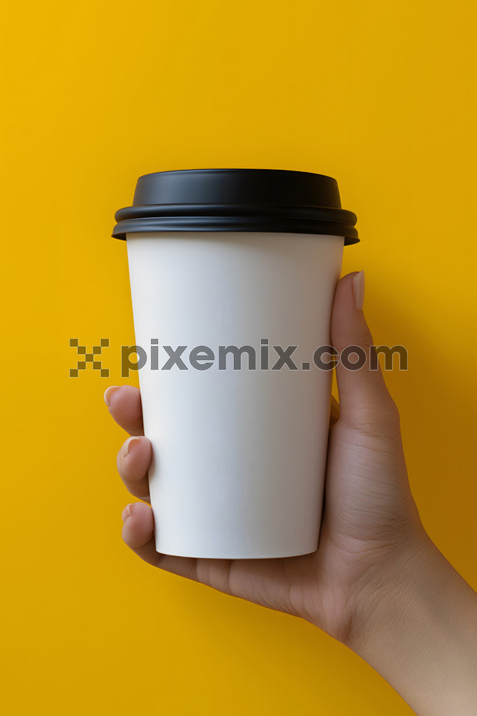 Minimalist shot of a hand holding a blank white takeaway coffee cup with a black lid against a vibrant yellow background.