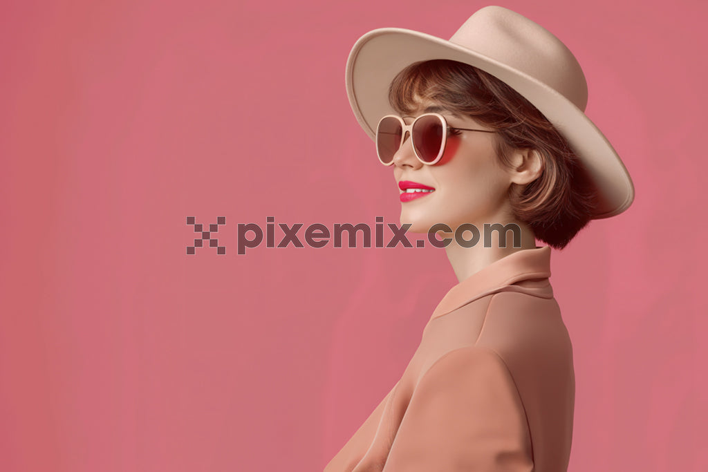 Stylish woman wearing a chic beige hat and sunglasses, dressed in elegant fashion with a monochrome pink background.