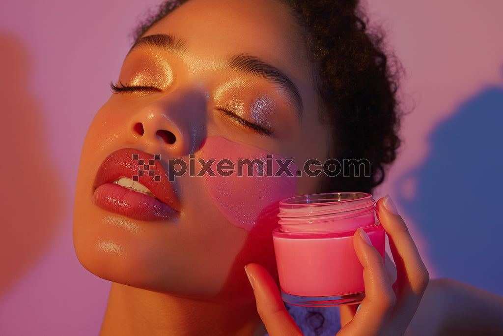 Radiant woman applying a pink facial mask, glowing skin illuminated by warm lighting, showcasing beauty and skincare elegance.