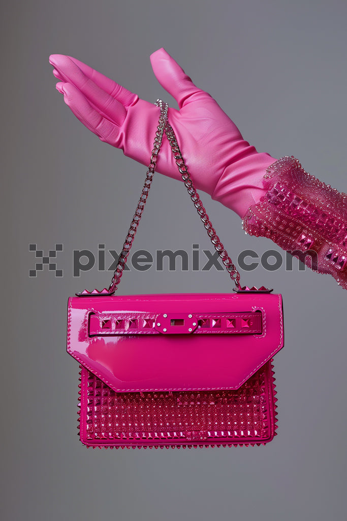 Luxurious hot pink designer handbag held by a stylish hand in gloves, showcasing glamorous fashion and elegance.