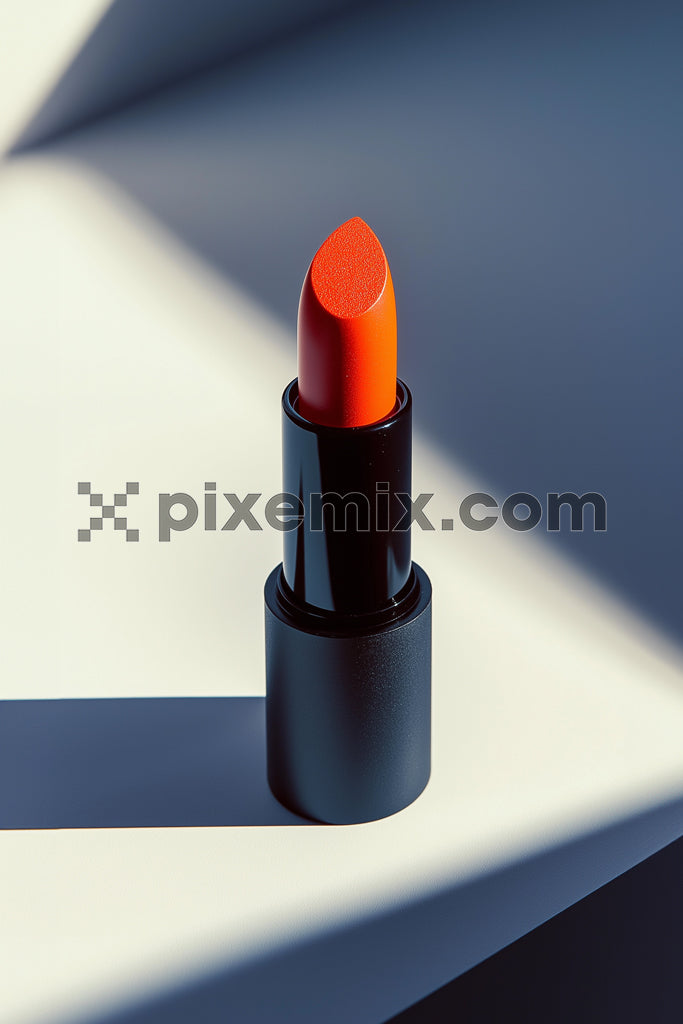 Minimalist Beauty Product Photography with red Lipstick in black case stock image.