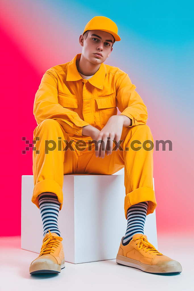 A stylish young man in vibrant orange outfit, sitting on a white cube, against a bold gradient background of pink and blue.