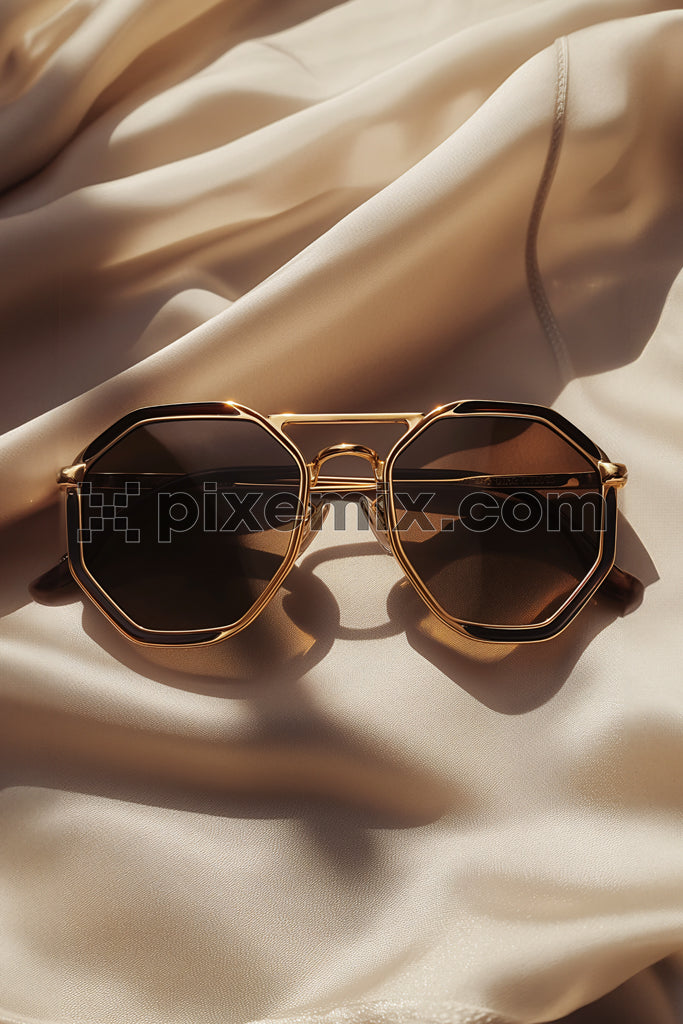 Luxury gold sunglasses with geometric frame resting on elegant satin fabric in warm sunlight stock image.