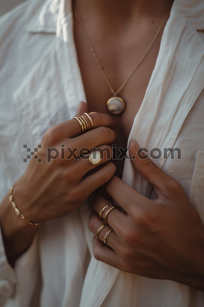 Elegant jewelry showcase with gold rings and pearl necklace stock image.