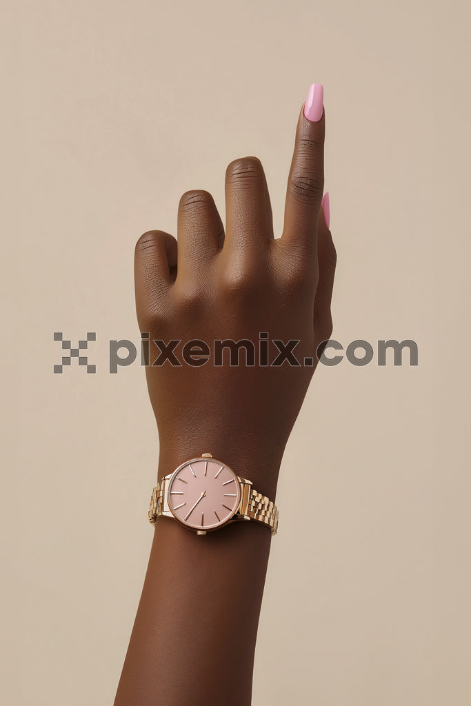 A stylish close-up of a dark-skinned hand elegantly raised, adorned with a gold watch stock image.