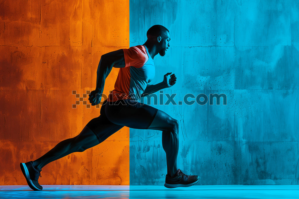 Dynamic runner in motion, split by bold orange and blue lighting for a high-energy effect stock image.