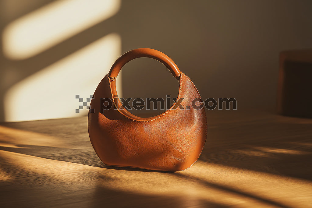 A stylish brown leather handbag placed on a wooden surface, illuminated by warm sunlight shadows stock image.