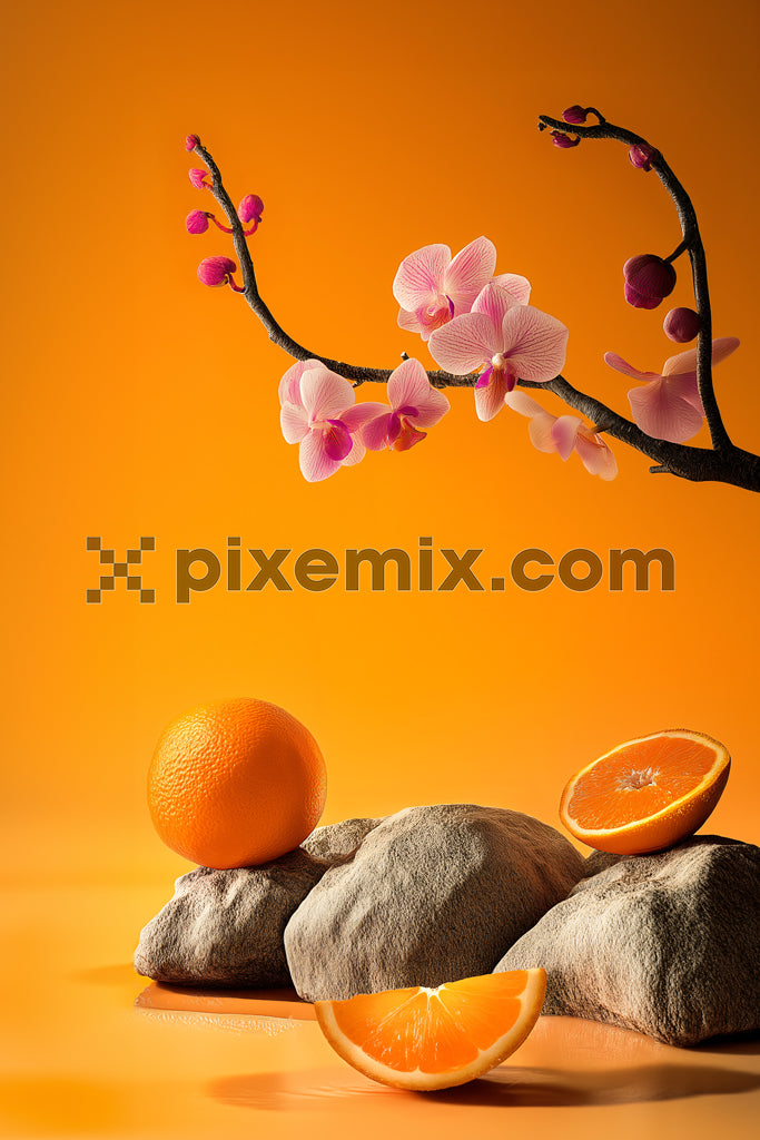 A vibrant still life of oranges and orchids against an orange gradient background with rocks stock image.