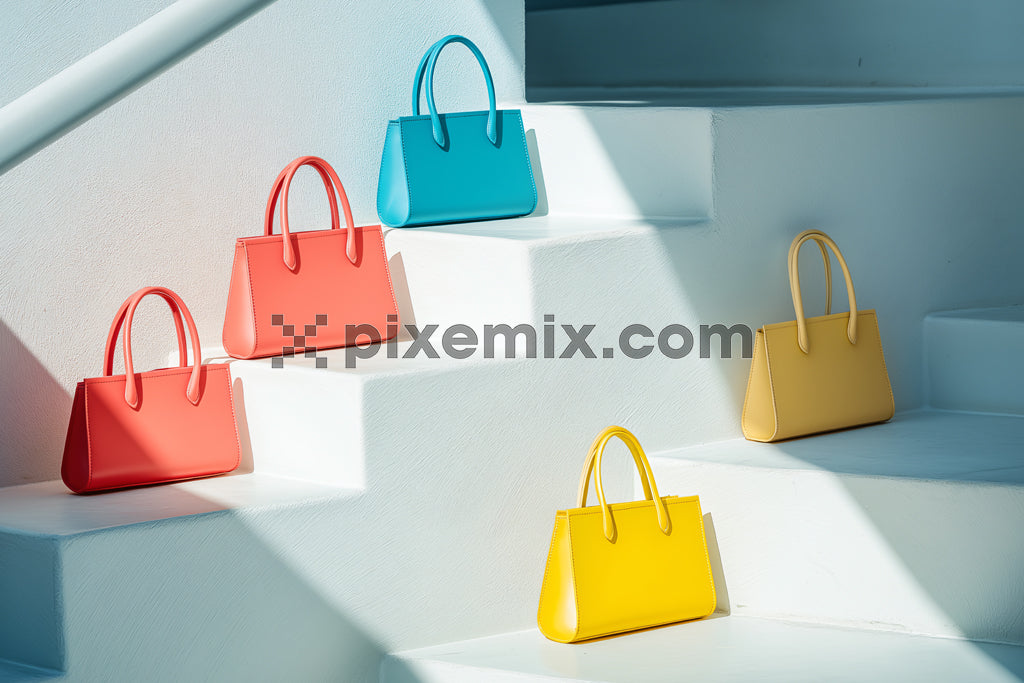 Stylish pastel handbags collection displayed on white stairs in sunlight stock image.
