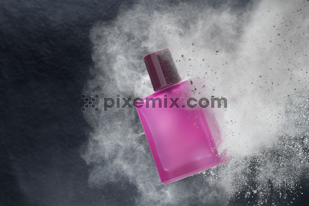 Pink perfume bottle exploding through powder, dynamic beauty product shot on dark textured background stock image.