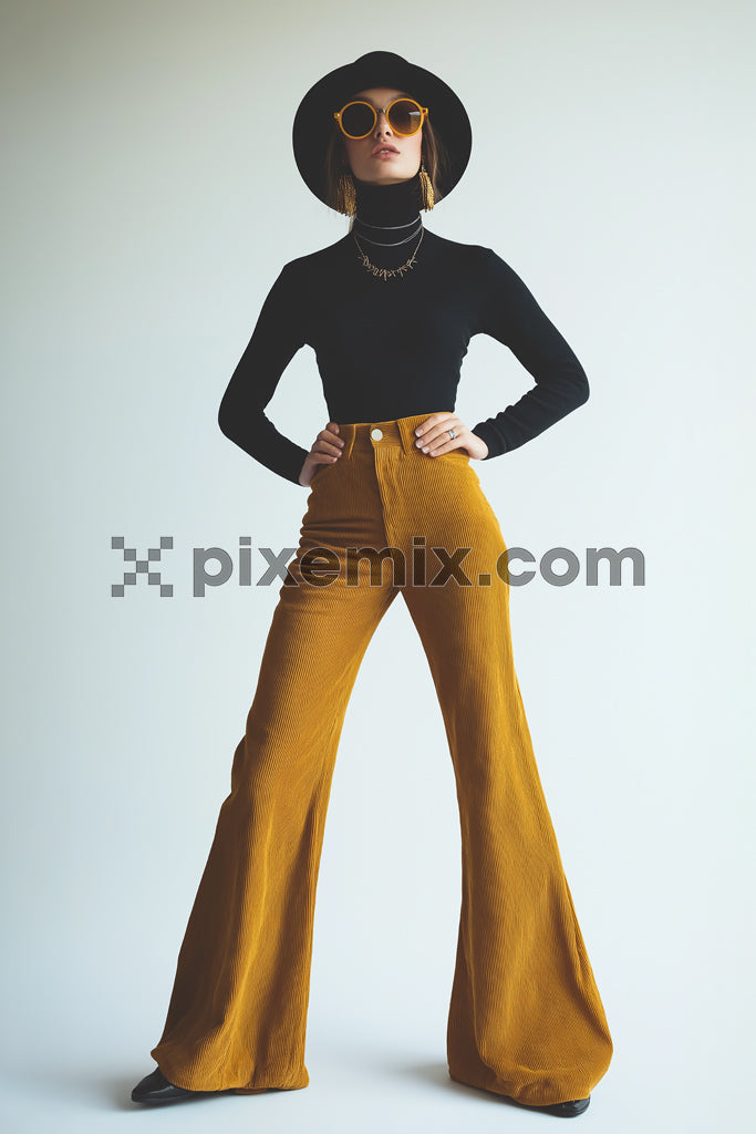 Fashion model in retro outfit with mustard flared pants, black turtleneck, hat and round sunglasses stock image.
