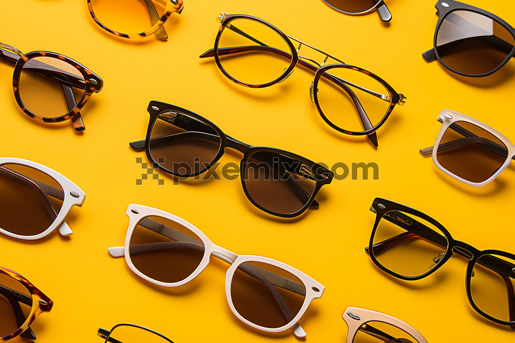 Trendy assortment of modern sunglasses and eyeglasses in various frames on vibrant yellow background.