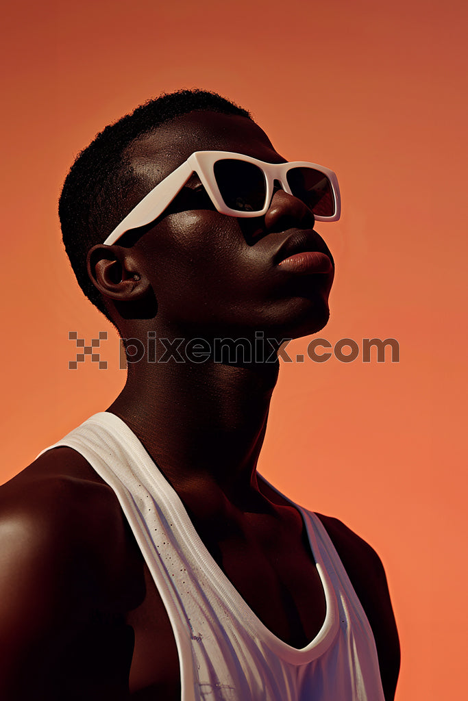 Stylish man in white sunglasses against orange background stock image.
