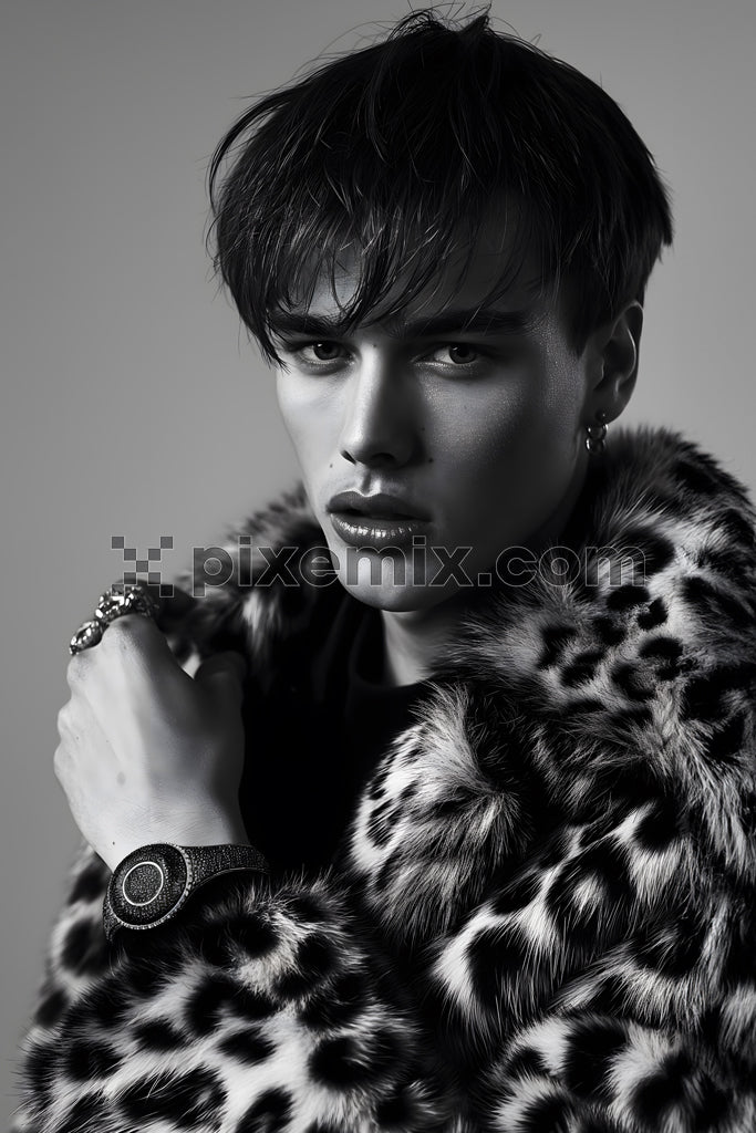 Stylish man in leopard fur coat with luxury watch and rings in dramatic black-and-white portrait stock image.