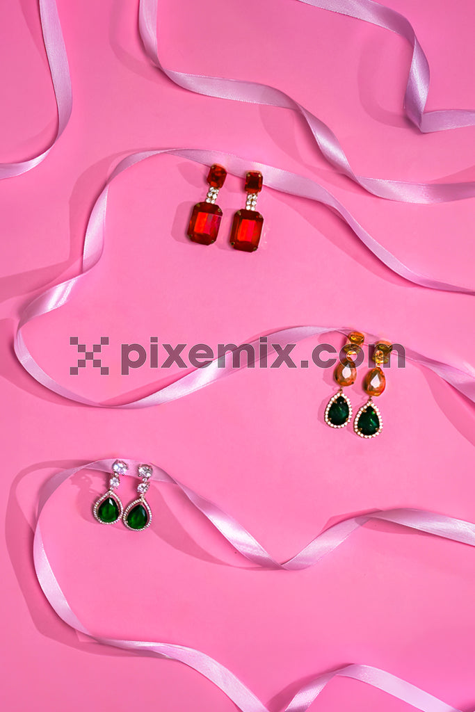 Elegant gemstone earrings displayed on pink background with satin ribbon for festive jewelry flat lay stock image.