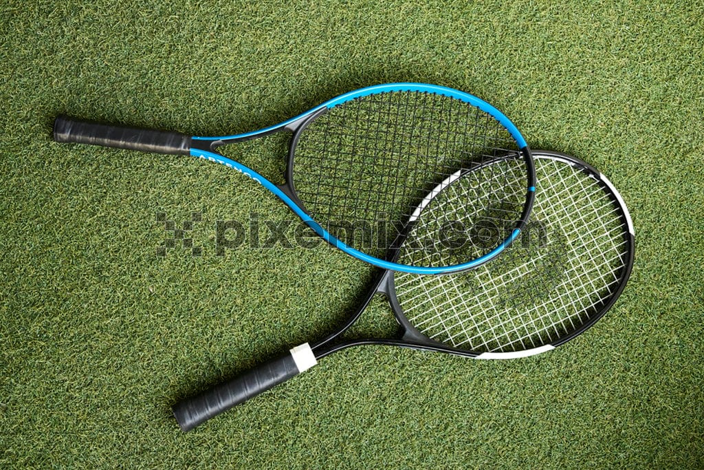 Two tennis rackets lie side-by-side on a green tennis court image.