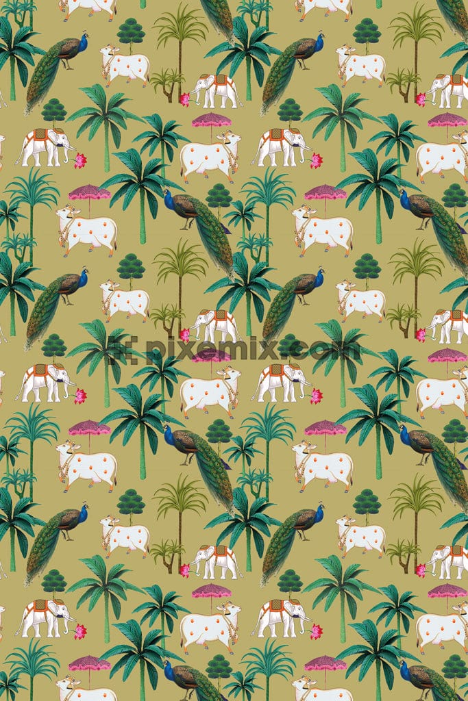 Pichwai art inspired white cow and peacock product graphic with seamless repeat pattern
