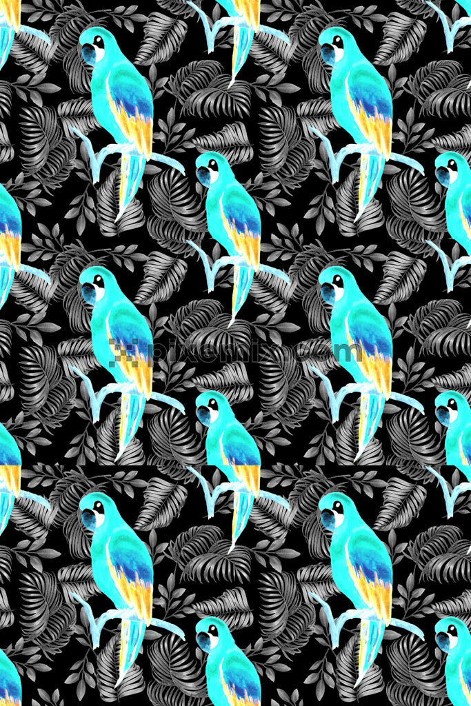 Monochrome leaves & blue parrot product graphic with seamless repeat pattern