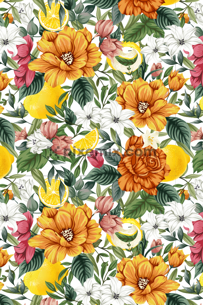 Lemon and floral colorful product graphic with seamless repeat pattern