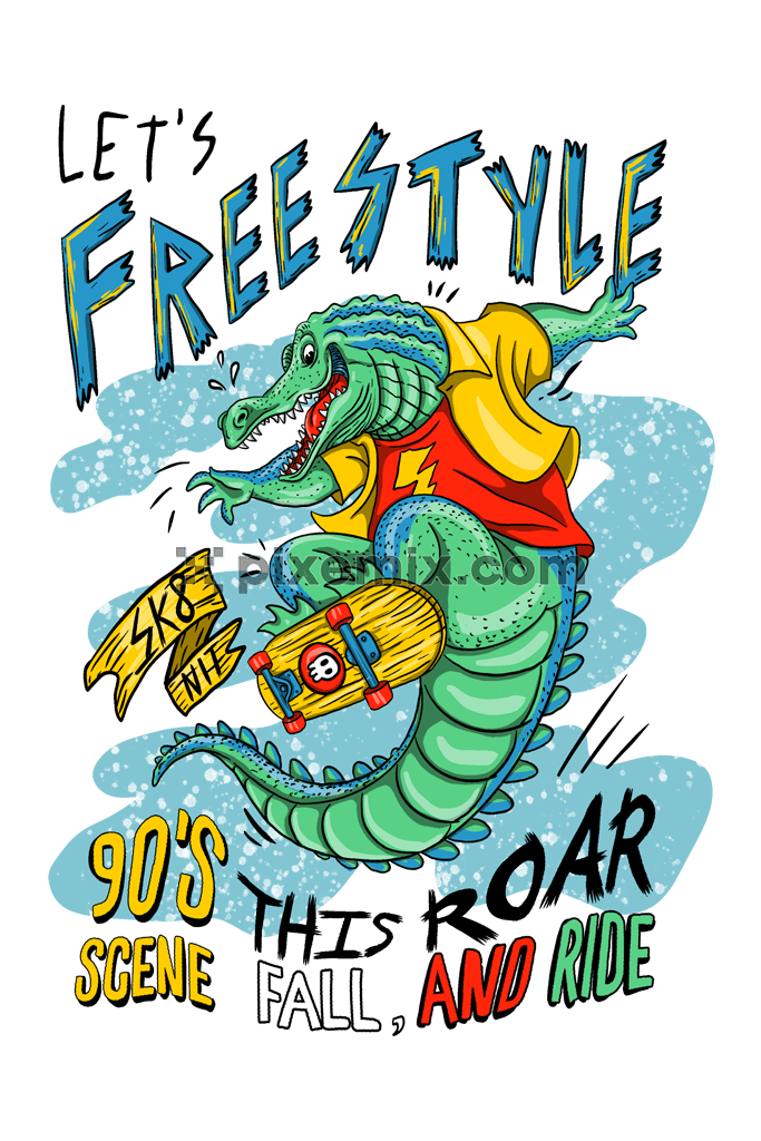 A freestyle fashion inspired cartoon graphics featuring a crocodile and a skate board