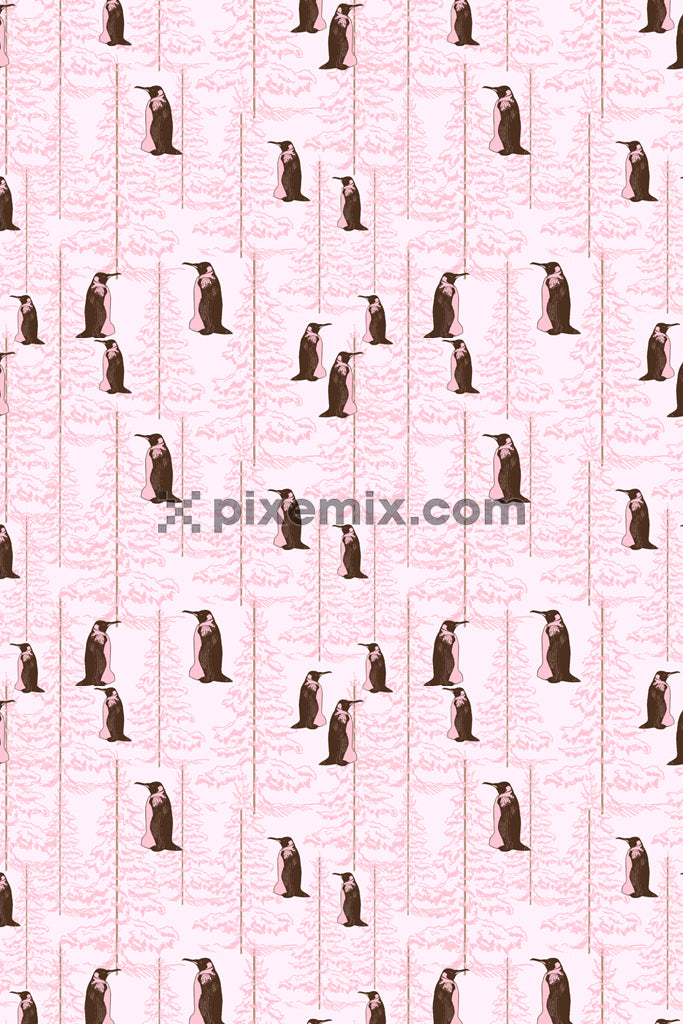 Lineart tree and penguin product graphic with seamless repeat pattern