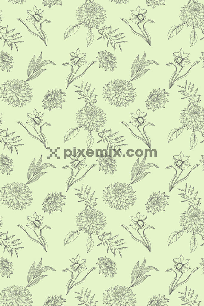 Lineart florals and leaf product graphic with seamless repeat pattern