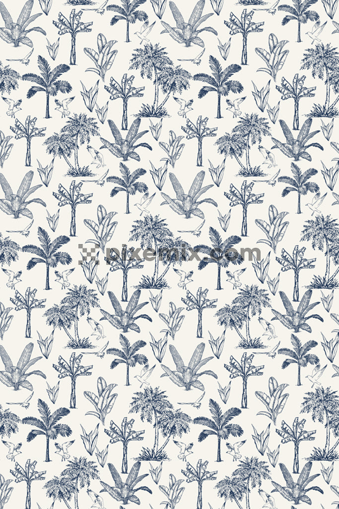 Lineart inspired tropical tree and birds product graphic with seamless repeat pattern