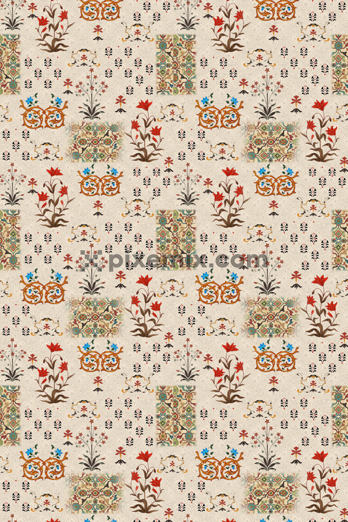 Mughal art inspired florals and leaf product graphic with seamless repeat pattern