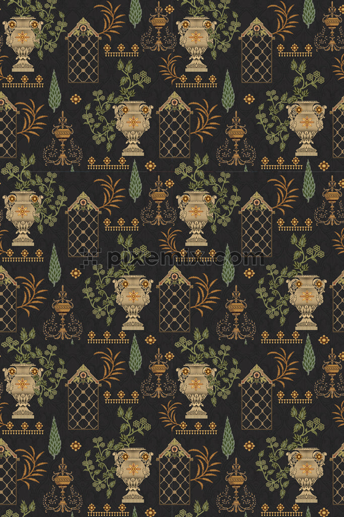 Mughal art inspired tropical leaves product graphic with seamless repeat pattern