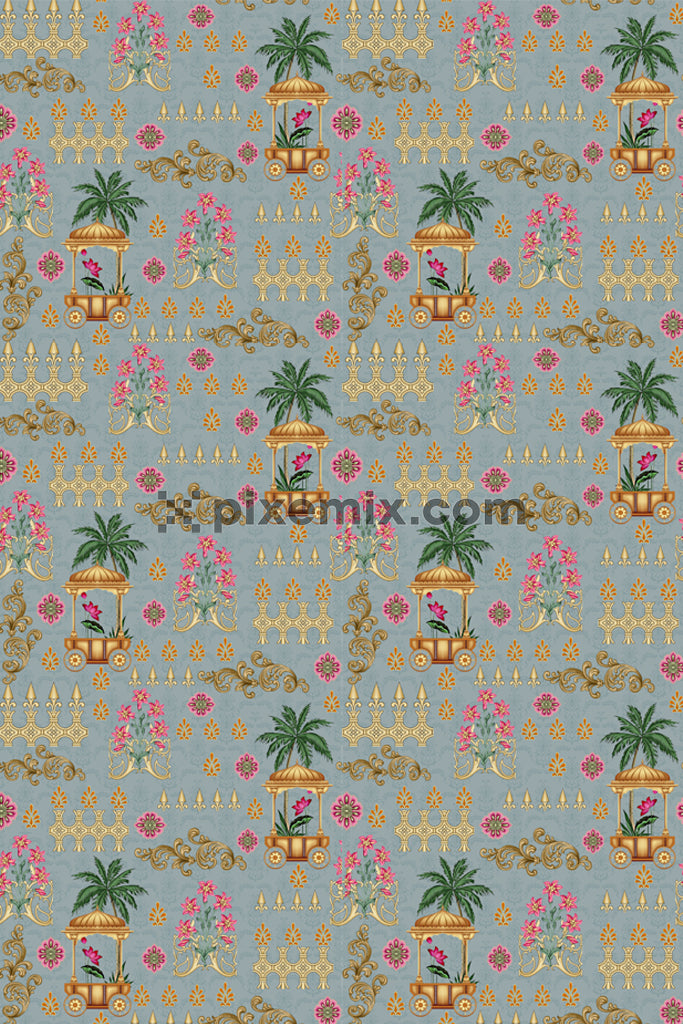 Mughal art florals and leaf product graphic with seamless repeat pattern