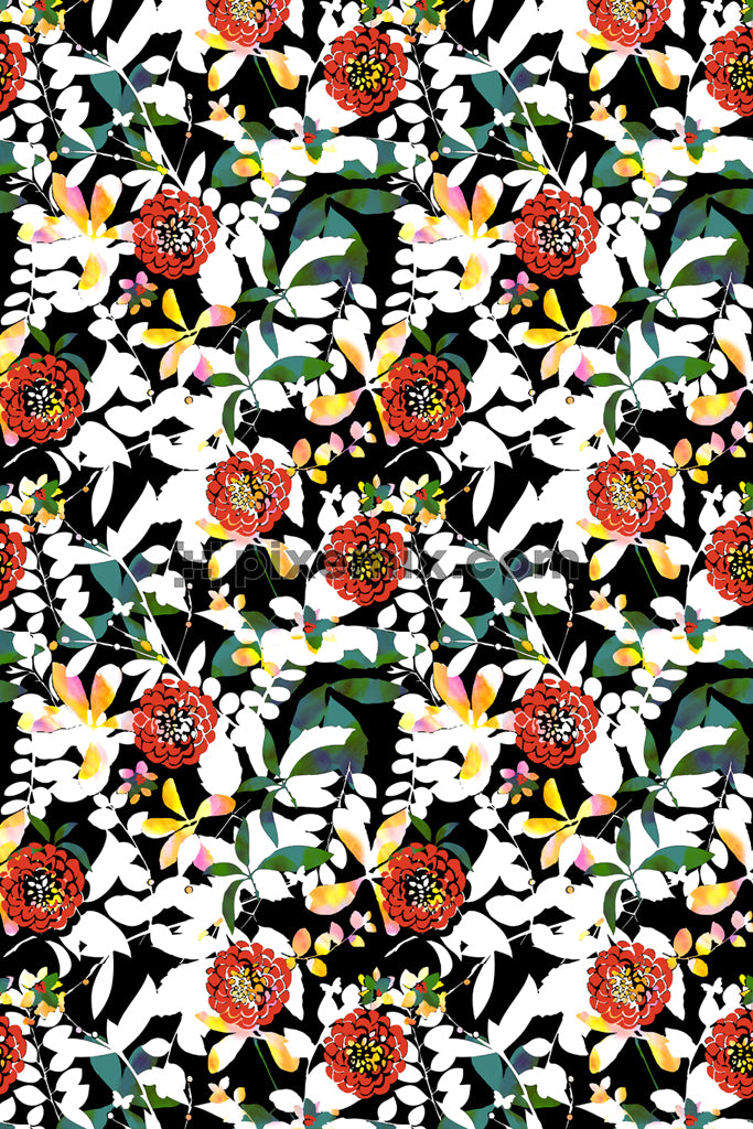 Negative positive florals & leaves product graphic with seamless repeat pattern & watercolor effect