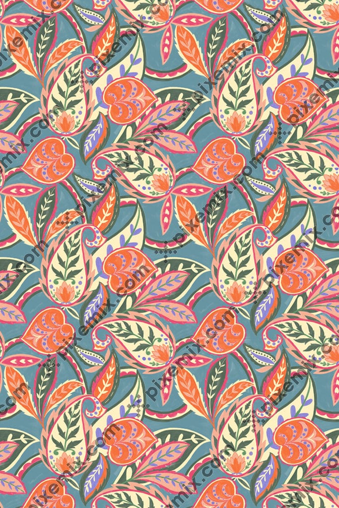 Hand-drawn paisley and leaves product graphic with seamless repeat pattern.