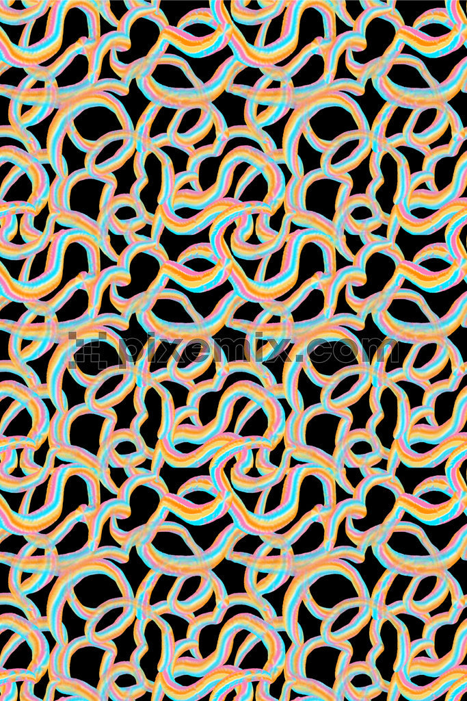 A psychedelic, colorful, wavy pattern featuring vibrant neon-like lines on a black background.