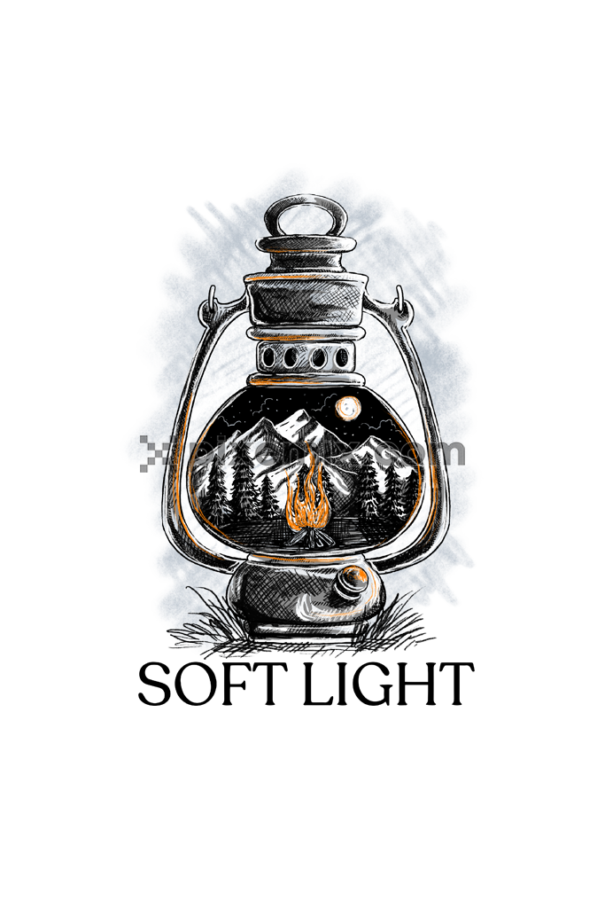 A unique hand-drawn fashion graphic featuring a vintage lantern with a scenic mountain and campfire illustration.